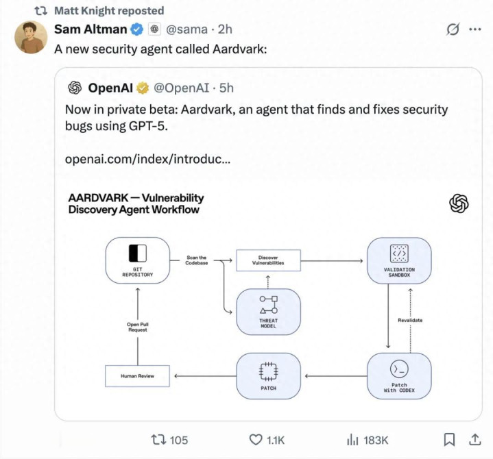 刚刚,OpenAI发布由GPT-5驱动的“白帽”Agent——Aardvark(土豚)。